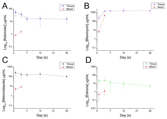 In vivo release of (A) ketorolac, (B) bleomycin, (C) metronidazole, (D) estrone from the resorbable nanofibrous prolapse meshes.