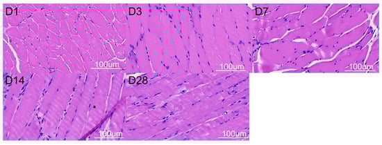 Hematoxylin and eosin staining of tissues. (D1 represents as day 1; D3 represents as day 3; D7 represents as day 7; D14 represents as day 14; D28 represents as day 28) (scale bar: 100 μm).