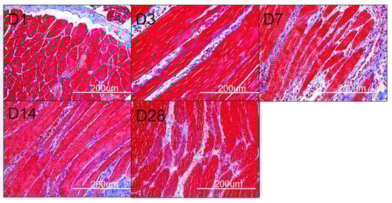 Histological images (400×) with Masson’s trichrome stain post-implantation. Red area: muscle fiber, blue area: collagen fiber. (D1 represents as day 1; D3 represents as day 3; D7 represents as day 7; D14 represents as day 14; D28 represents as day 28) (scale bar: 200 μm).