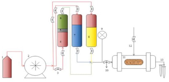 Different fluid samples to be used are filled in 1, the fluid pump indicated by 2 is used to fill or re-fill the accumulators (4, 5, 6, 7, and 8) with the fluids to be injected. The valves indicated by 3 are used to isolate a fluid accumulator when another fluid is to be injected. The core samples are placed in the core holder labeled 11, and the effluents of oil and water are collected in test tubes indicated by 13. The tests were carried out at a differential pressure of 27 psia and temperature of 27 °C.
