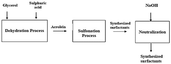 The schematic for the sulfonating process is shown in Figure 4. A beaker with a motor stirrer was used to combine vegetable oil, sulfuric acid, and glycerol. The glycerol in the presence of a catalyst (sulfuric acid (H2SO4)) was formed via the dehydration of Acrolein. In the development of detergents and acrylic acid esters, acrolein is an essential and versatile chemical intermediate.