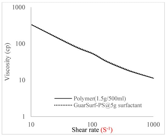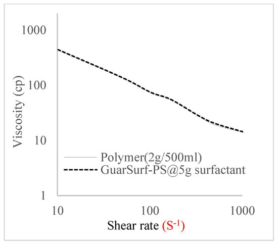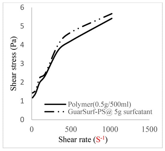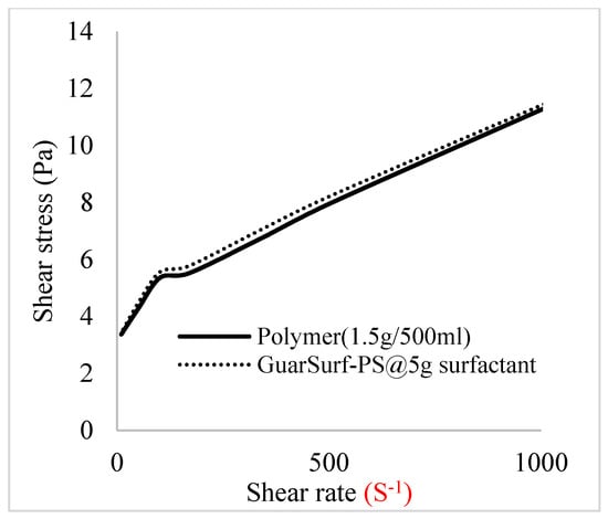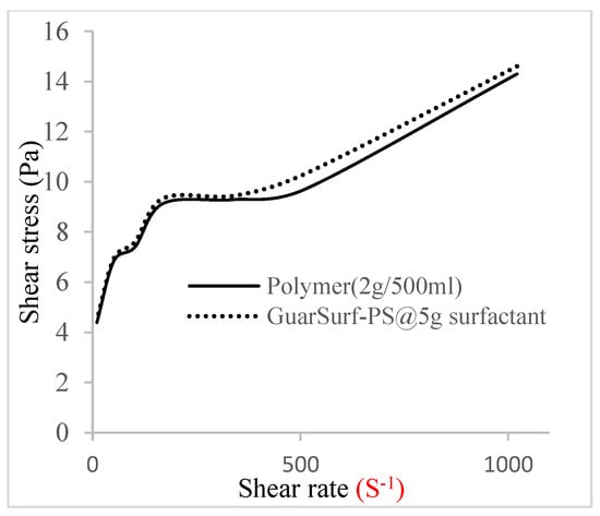 The shear stress versus shear rate and viscosity versus share rate relationships for the polymer mixtures and polymeric surfactant concentrations are shown in Figure 5, Figure 6, Figure 7, Figure 8, Figure 9, Figure 10, Figure 11, Figure 12 and Figure 13. The charts show an increased viscosity for the polymeric surfactant compared to the polymer concentration.