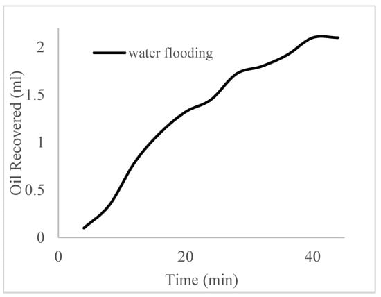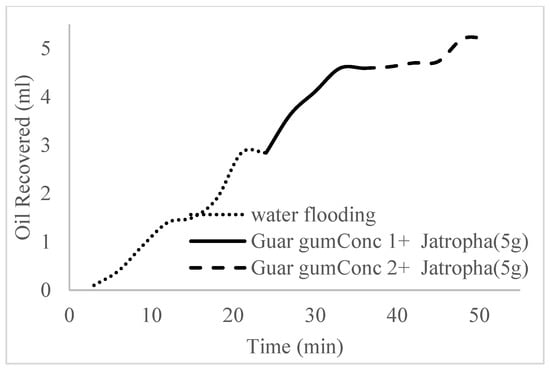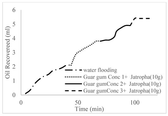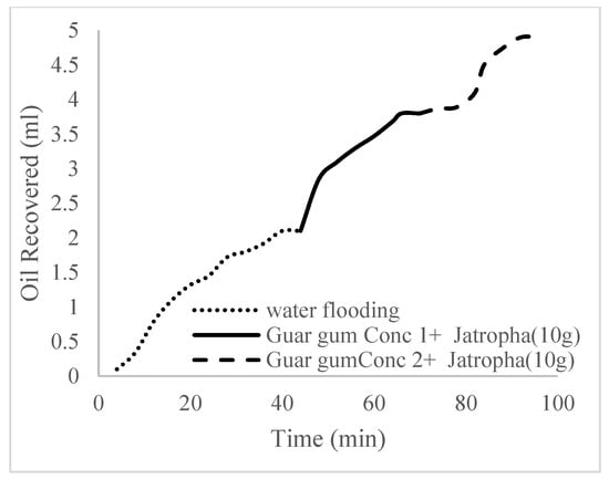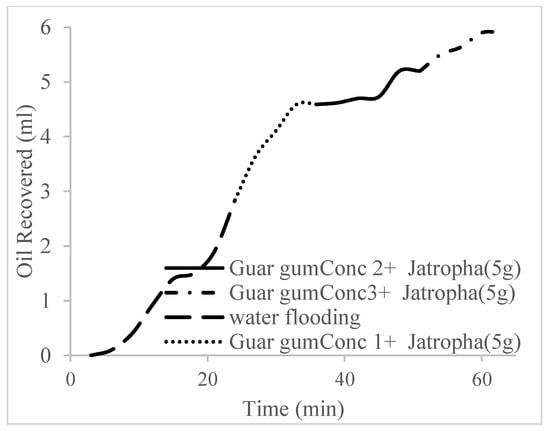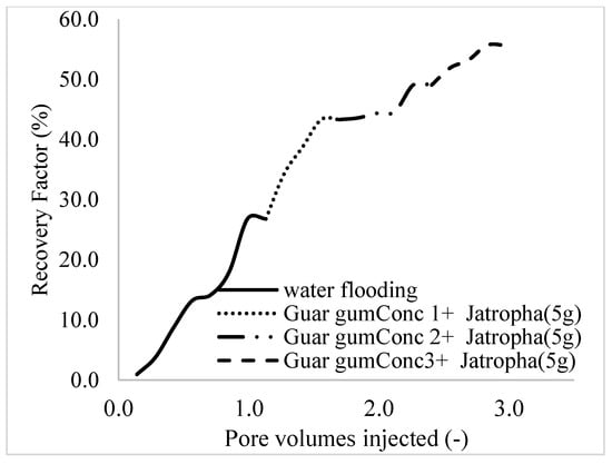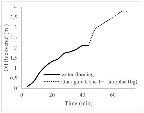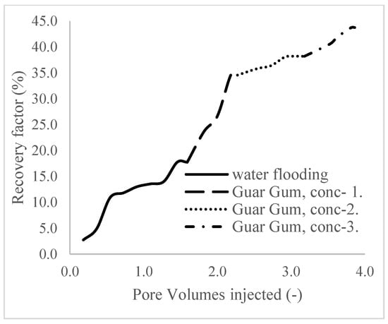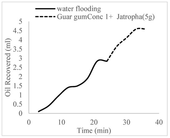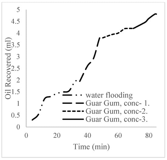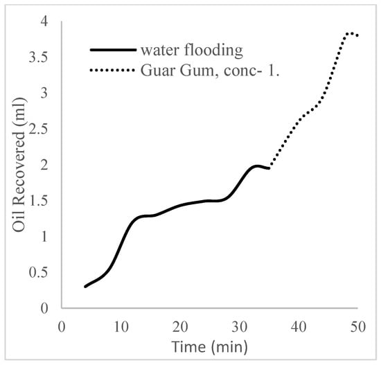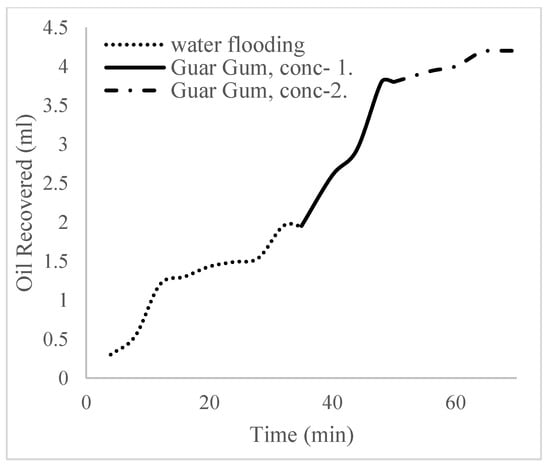 The plots in Figure 14 show the trend of oil recovery via water to polymer injection at different concentrations. A total of 1.6 pore volumes of water were injected at 3 mL/min. A total of 1.95 mL of oil was recovered during this process giving an oil recovery factor of 17.7% at the end of a water breakthrough time of 4 min (Figure 14). The first concentration of Guar gum (1% wt.) was introduced to flood 2.3 volumes of the pores and increased the oil recovery to 3.8 mL (Figure 15) giving an oil recovery of 34.5%. The second and third weight percentages of Guar gum were introduced to flood 3.2 and 3.9 pores of the core sample, respectively. The oil produced and recovery factors for the second polymer injections were 4.2 mL and 34.7% and for the third were 4.81 mL and 43.7% (Figure 16 and Figure 17). The incremental oil recoveries recorded for the water flooding for the polymer concentrations at 1 wt%, 1.5 wt%, and 2 wt% were 16.8%, 17%, and 26%, respectively and at a water breakthrough time of 50 min, 70 min, and 85 min. This suggests that increasing the polymer concentrations would ultimately increase the oil recovery due to the increase in viscosity of the injection phase. Figure 17 and Figure 18, respectively, describe the full trend of the oil recovery and oil recoveries per injected pore volume. Table 5 shows the summary of the cumulative oil recovery via each flooding procedure.