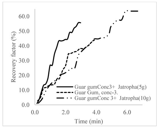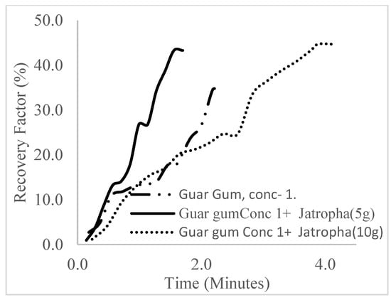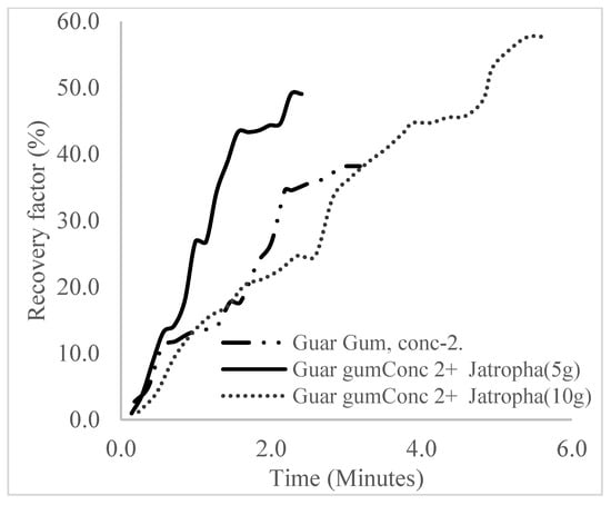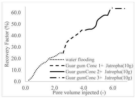 The application of polymers and surfactants as a chemical-enhanced oil recovery (EOR) technique has become a promising technique for the efficient recovery of oil [,,]. Biosurfactants and biopolymers are of importance as most are derived from non-edible seeds which are inexpensive, readily available, and environmentally friendly []. Various methods have been employed to extract surfactants from solid and liquid components []. From the studies of [], anionic surfactants are synthesized from soapnut oil through a trans-esterification process using fatty acids followed by sulfonation of the fatty acid methyl ester. An experimental sensitivity analysis of the factors that affect surfactant solutions during enhanced oil recovery processes was conducted by []. Their results indicated an incremental oil recovery of 13% via surfactant slug injection. The phase behavior of microemulsions stabilized with surfactants derived from Jatropha oil was studied by []. They estimated an average of 31% incremental oil recovery during the slug injection of surfactants and concluded that microemulsions stabilized with surfactants have effective interfacial, rheological, and flooding properties to recover residual oil. It is important to note that the addition of surfactants to an emulsion mixture (emulsification process), such as polymers, helps to effectively increase the viscosity of the displacing fluids and drastically reduce the interfacial tension. The effect of the emulsification on the performance of enhanced oil recovery is the control of the mobility of the displacing fluid and increase in the swept volume.