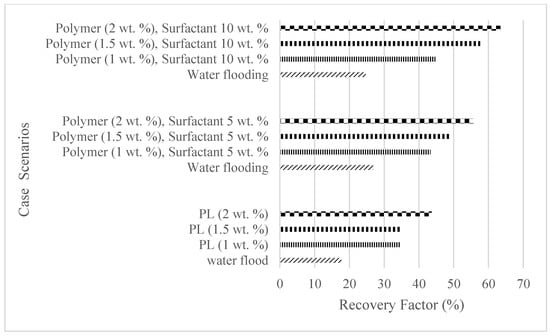 From the description in Figure 5, Figure 6, Figure 7, Figure 8, Figure 9, Figure 10, Figure 11, Figure 12 and Figure 13, 3 polymer concentrations that performed well with respect to viscosity were selected with their resulting mixtures with surfactants. Each of the following case scenarios commenced with initial water flooding. Thus, the case scenarios are shown as follows: