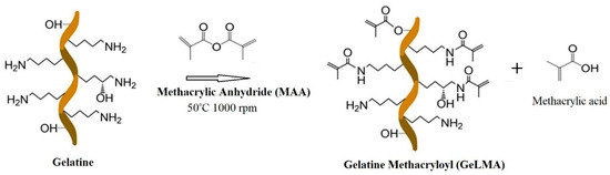 The synthesis of GelMA occurred by the reaction of gelatin and methacrylic anhydride. The reaction of the Ɛ-amino (-NH3) groups contained in gelatin with methacrylic anhydride resulted in gelatin methacryloyl and methacrylic acid (Figure 1) in the environment. Dialysis was performed in order to remove the methacrylic acid occurring in the environment.