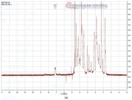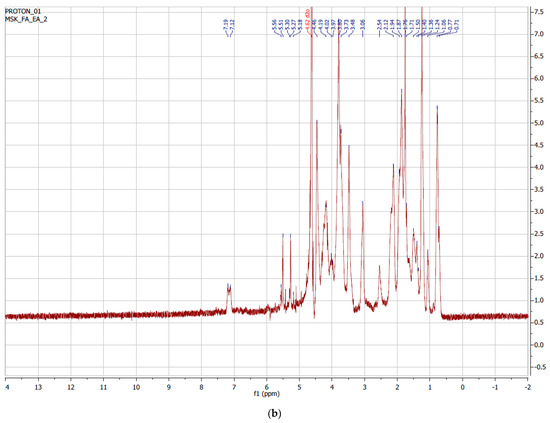 Nuclear Magnetic Resonance (NMR) measurements of the pure gelatin of the synthesized GelMAs were performed. The obtained NMR data were examined and the degree of methacrylation was determined. Figure 3a shows the 1H-NMR spectra of pure Type B gelatin. The signal from the methylene group of lysine amino acid in the structure of gelatin was observed between 2.8 and 2.95 ppm. In Figure 3b, it can be observed that there was no signal from lysine seen at 2.8–2.95 ppm. It was observed that there was a higher yield than the GelMA synthesized in a single buffer medium. At the same time, it was observed that the signal from lysine between 2.8 and 2.95 ppm decreased or disappeared, and a signal from methacrylate between 5.4 and 5.6 ppm occurred. When we examine the signals in the spectra, it can be said that GelMAs were successfully synthesized from gelatin. The degree of methacrylation was found to be greater than 95% after examining the NMR peak regions in the synthesis of GelMA from gelatin. The equation below was used for this calculation.