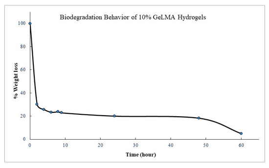 After the GelMA hydrogels were synthesized, hydrolytic degradation studies were performed. Degradation studies were carried out by taking measurements at regular intervals in a water bath with a shaking temperature of 100 cpm at 37 °C at a buffer pH = 7.4 PBS. The measurements were continued until the degradation of the hydrogel was completed. When the biodegradation trials of the GelMA hydrogels were examined, it was observed that the biodegradation reached 97% at the end of approximately 60 h in the hydrolytic degradation of 10% GeLMA hydrogels. It was observed that the biodegradation of hydrogels reached 70% in the second hour. But then the rate of degradation continued to slow down. The experiment was continued until the degradation of the hydrogels was completed (Figure 6). The biodegradations of the GelMA biocomposite hydrogels were not significantly affected by the presence of HYA, HA, and AgNPs, which was interpreted as because of the absence of chemical interaction between GelMA and other constituents.