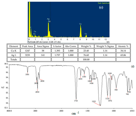 Synthesized AgNPs: (a) TEM photos; (b) particle size distribution; (c) EDS analysis; (d) and FTIR spectrums of synthesized AgNPs.