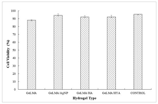 The viability of the L929 cells treated with injectable hydrogel structures was determined by 3-(4,5-Dimethylthiazol-2-yl)-2,5-Diphenyltetrazolium Bromide (MTT) assay with some modifications for 24 h [40,41]. The cells were first applied to 96-well plates at a density of 2 × 104 cells/well in triplicate and incubated for 24 h. Later, the hydrogel samples (GelMA, GelMA/AgNP, GelMA/HA, and GelMA/HYA) were separately placed on each well in sterile conditions and incubated for 24 h. After the incubation time, the treatment medium in the wells was replaced with 100 μL of fresh culture medium. Then, 10 μL of MTT solution (5 mg/mL in PBS) was added to all wells. After the microplates were additionally incubated for 4 h, the medium was carefully discharged, and 100 μL of DMSO was added to each well to solubilize the formazan crystals formed by viable cells. Then, the microplates were shaken at 150 rpm for 5 min. The absorbance (Abs) was measured at 540 nm using a spectrophotometer (ThermoScientific, Multiskan FC, Waltham, MA, USA). The cells not treated with the hydrogelwere used as a control group. The cells were photographed before the addition of MTT. All experiments were repeated three times and the results are expressed as the percentage of cell viability according to the following equation [42].