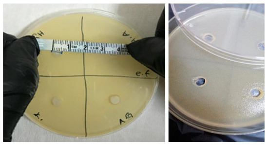 The incubated microorganisms were adjusted to the 0.5 Mc Farland standard. Agar well diffusion experiments were conducted in Petri dishes with a diameter of 90 mm containing Mueller Hinton Agar to a depth of about 4 mm to determine the antimicrobial activity. For this purpose, 200 µL of each microorganism was inoculated separately into 25 mL Mueller Hinton Agars and poured into petri dishes. After the solidification of the Petri dishes, wells were drilled on the agar using a sterile cork drill with a diameter of 6 mm, and 50 µL of the tested hydrogels was dripped into these wells. The prepared Petri dishes were kept at 4 °C for 24 h to diffuse the hydrogels. After that, the Petri dishes were left incubating for 24 and 48 h under an appropriate incubation temperature for each microorganism. All tests were performed in two copies under aseptic conditions. Microbial growth was determined by measuring the diameter of the inhibition site in millimeters [43,44,45].