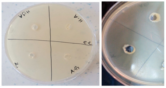 Photos of Escherichia coli (ATCC 35218 strain) after 24 h incubation (the highest diameter is seen in GelMA/AgNP hydrogel).