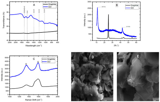 Figure 1 shows the results of the GO characterizations. The GO infrared spectrum is shown in Figure 1A, whereby it is possible to appreciate the appearance of signals attributed to the oxygen incorporation into the carbon structure, which indicates correct oxidation of the material during the synthesis process. The sign around 1040 cm−1 is attributed to the epoxy stretching mode (C-O-C) located on the basal plane of the graphene oxide. The bands at 1220 cm−1 and 1390 cm−1 correspond to the bending mode of the hydroxyl groups (C-OH) on the basal plane. The sign at 1620 cm−1 corresponds to C=C vibrations of the graphene skeleton. Finally, at 1710 cm−1, a signal corresponding to carbonyl functional groups (COOH/C=O) is observed at the edge of the graphene oxide sheets [16,18]. The graphite FTIR spectrum is also shown, the signals of the oxygen groups mentioned above are absent. In Figure 1B, the GO diffractogram is shown, in which two peaks can be seen, the first around 11° in the 2θ scale, which is characteristic of the crystalline plane (0 0 2) of the graphene oxide, while the second peak at 42° is typical of the crystalline plane (1 0 0) of the graphene oxide [19,20]. The usual peak of the graphite appears at 26°, so the fact that this peak does not appear in the diffractogram indicates the change in the material’s structure when oxidizing the graphite and obtaining graphene oxide. The Raman spectrum is shown in Figure 1C, in which two bands can be observed; the first, known as D-band (around 1340 cm−1), is associated with the imperfections in the graphene layers at the boundaries of the graphene particles and related to the alteration of aromatic hexagonal rings due to the existence of sp3 hybridizations including breaks in them. In contrast, the G-band (around 1590 cm−1), named the graphite band, and is associated with the stretching vibrations of the carbon atoms in the plane. In the graphite, the G-band is much more pronounced than the D-band, so this decrease in the intensity of the G-band indicates the good exfoliation of the graphite and the obtention of GO [21,22]. Lastly, the SEM micrographs of GO at 5000 and 15,000 magnifications are shown in Figure 1D and Figure 1E, respectively, in which the typical morphology of GO can be appreciated, which consists of a structure similar to wrinkled sheets or layers, thin and randomly aggregated, corroborating the oxidation of the multiple well-oriented layers of graphite [23,24]. These results confirm the good graphite oxidation and the obtention of GO.