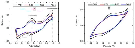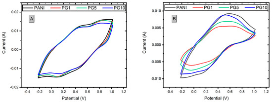 The voltammograms of the synthesis of PANI, PG1, PG5, and PG10 materials are shown in Figure 2. Figure 2A shows cycle 10th of the synthesis of the materials in which the characteristic signs of polymer formation can be seen. The PANI material presents two peaks in the anodic part, the first around 0.32 V, corresponding to the aniline oxidation when changing from the leucoemeraldine form to the emeraldine form. The second peak, around 0.98 V, is attached to the oxidation of emeraldine to the pernigraniline form. In the cathodic part, two peaks are observed in 0.2 V and −0.15 V, which correspond to the reduction of PANI, as well as to the decrease in degradation products (p-benzoquinone/hydroquinone and p-aminophenol), respectively [25,26,27]. The PG1 material presents practically the same signals as the PANI material. Meanwhile, the PG5 and PG10 materials show a slight displacement to the left in the anodic signals, which can be attributed to the presence of GO in the system since, due to its good conductivity, the GO causes a better ionic transference in the medium, thus causing less potential to be needed to oxidize PANI. Likewise, the slight decrease in the signal or area under the curve of the GO-containing materials is attributed to the fact that GO competes with polyaniline for a place at the electrode/solution interface during synthesis, generating a modification in the particle diffusion in the mixture (in comparison to the PANI material), causing fewer aniline molecules to be available near the working electrode that can be polymerized [28].
