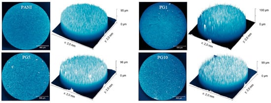 The optical micrographs of synthesized materials are shown in Figure 3. A 3D cross-sectional profile accompanies these micrographs to visualize the film’s uniformity. The PANI material presents a better uniformity than the other three materials since the materials with GO show slight distortions in uniformity, which can be appreciated in the 3D cross-sectional analyses. This result is congruent with that obtained in the cyclic voltammetry analysis since the existence of GO in the solution during the film synthesis leads to a decrease in the concentration of available aniline near the surface of the working electrode, which leads to a reduction in the uniformity of polymer growth. Despite the mentioned, the variation in film uniformity of the GO-containing materials is very slight; no noticeable agglomerations are generated, and all films show very similar growth, so the film growth is satisfactory.