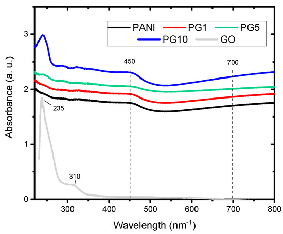 The UV-visible spectra of the synthesized materials are shown in Figure 5. Two characteristic PANI signals are present in all PANI-GO materials, around 450 and 700 nm−1. The first band is attributed to the π–π* transition of a C-C aromatic bond, while the second absorption band is due to the formation of the polaron or bipolaron states for charged defects in the polyaniline [32,33]. The GO spectrum shows two typical signals around 235 and 310 nm−1, corresponding to π–π* transitions of C=C and n-π* transitions of C=O respectively [34]. The typical GO signal at 235 nm−1 does not appear in the PG1 material, which is attributed to the low GO loading, while in the PG5, material a small signal at that wavelength can be seen. In the PG10 material, the appearance of the signal is more noticeable (material with higher GO load). This is an indication of the formation of the PANI-GO composite.