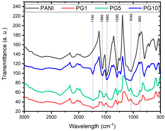 Figure 6 shows that all the FTIR spectra have a similar profile, indicating the syntheses’ good. Analyzing the PANI spectrum, the signal obtained at 880 cm−1 corresponds to the vibration of the C-H bond outside the plane, which means a change in the angle of one of the characteristic C-H bonds of PANI. This signal also indicates branched polymer chains; in materials PG1 and PG5, the intensity of that signal decreased, indicating a slight perturbation in the structure of these materials due to the small amounts of GO used. The signal close to 1040 cm−1 identifies N-H+ bond stretching; meanwhile, at 1290 cm−1, a band representing the stretching of the C-N bond appears. The 1480 and 1560 cm−1 signals are characteristic of the quinoid ring’s C-C and C=N stretching vibration, respectively, revealing the PANI chains in their base emeraldine form [33,35,36]. The spectra of the GO-modified materials show small shifts and broadenings in the typical PANI signals, which is attributed to the presence of GO. The decrease in the intensity of the typical PANI signals in PANI-GO materials indicates the functional groups’ disappearance due to chemical reduction caused by the binding of PANI to GO. In addition to the mentioned above, the appearance of the signal around 1740 cm−1 in the PG1, PG5, and PG10 materials is indicative of the binding of the carboxyl group of GO to the nitrogen of the main chain of PANI [37]. Those mentioned above will indicate a chemical combination between PANI and GO during the synthesis, strengthening the argument exposed in the SEM analysis of the materials.