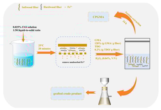 CPGMA preparation and analysis were performed according to our previous methods [,,]. As shown in the following Figure 1, after the pulp fibers were measured, they were mixed with a recently made 0.025% FAS solution at a 1:50 liquid-to-solid ratio. The mixture was well mixed and allowed to macerate at 25 °C for 20 min. The fiber samples were properly cleaned to get rid of any unabsorbed Fe2+ after the reaction was complete. After moving the fiber-containing Fe2+ into a container, the pulp concentration was adjusted to 6% by adding the necessary amount of distilled water. After complete mixing, GMA at 120% (g GMA/g fiber) and TDO at 0.2% (g TDO/g fiber) were added in that order, followed by H2O2 (0.04%, v/v). The mixture was thoroughly mixed, and the temperature was increased to 65 °C for a duration of five minutes. At the end of the reaction, the grafted crude product of the grafting process was meticulously washed with deionized water. Acetone was utilized for a whole day to remove the crude product of the grafting process. CPGMA was the copolymer that was left over after the homopolymer was eliminated. The kraft pulp graft fibers that were bleached for hardwood and softwood purposes are referred to as H-CPGMAs and S-CPGMAs, respectively.