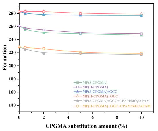 Paper formation has an impact on the overall characteristics of the paper in addition to its appearance. The formation is closely related to the effects of fluid dynamics, wave filtering, flocculation, shearing, and turbulence. The effects of CPGMA substitution on paper formation are depicted in Figure 2. The paper formation is affected by the filler retention and fiber flocculation. As seen from Figure 2, without using CPGMAs, the handsheet formed by MP + GCC possesses the best value, followed by the handsheet formed by MP and that formed by MP + GCC + CPAM/SiO2/APAM, which exhibits the worst value. The use of CPGMAs is considered for the comparison of six types of stock, demonstrating the same outcome as mentioned above. This may be primarily attributed to the small GCC size in the handsheet, which evenly distributes and fills in the small gaps between the fibers under the action of fluid dynamics to improve the handsheet formation. However, the CPAM/SiO2/APAM system causes a partial flocculation of paper stock fibers, resulting in an uneven fiber distribution and reducing the formation of handsheets.