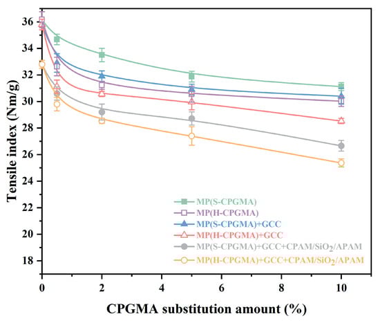 From the comparison of six stock systems, it was found that the CPGMA substitution amount ranges from 0% to 10%, and the sheet tensile strength decreases as the CPGMA substitution amount increases. There are two phases to the transition process that are characterized by a sharp fall prior to the substitution amount of around 0.5% and a slow decline after the substitution amount of approximately 0.5%. This trend may be attributed to the fact that when the substitution amount is low (<0.5%), the hydrophobic fiber CPGMAs possess a good dispersion and are well distributed among the stock fibers. This might successfully prevent hydrogen bonds from forming between the stock fibers and thus significantly weaken the sheet tensile strength. However, when the substitution amount is high (>0.5%), the hydrophobic fiber CPGMA dispersion becomes worse and overlaps with the increase in the concentration. Consequently, the hydrogen bond formation blocking ability between the stock fibers is weakened, and thus, the sheet tensile strength decreases gradually.