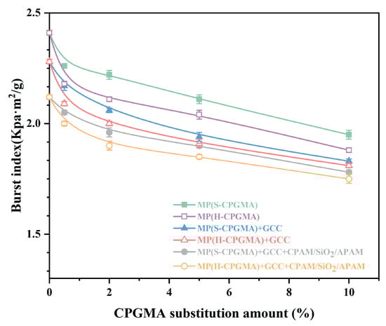 The factors affecting the bursting strength are the bonding force between fibers, fiber length, fiber strength, and fiber arrangement. The impact of the CPGMA replacement quantity on the paper sheet’s bursting strength is shown in Figure 4. When the CPGMA substitution amount is zero, the sheet bursting strength of MP is the highest, followed by MP+GCC. The bursting strength of MP + GCC + CPAM/SiO2/APAM is the lowest. The addition of GCC and CPAM/SiO2/APAM application decreases the bursting strength mainly because the GCC in the paper reduces the hydrogen bonding between the fibers. The GCC retention in CPAM/SiO2/APAM can be further improved, resulting in a decline in the bursting strength.