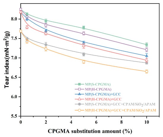 The paper tearing resistance is affected by fiber length, the bonding force between fibers, fiber orientation, fiber strength, and fiber interweaving. The impact of CPGMA replacement on tearing resistance is shown in Figure 5.