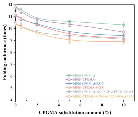 The main factors affecting the sheet folding endurance are fiber length, bonding force between fibers, fiber arrangement, fiber strength, and fiber elasticity. Figure 6 shows the effects of CPGMA substitution on the sheet folding endurance. The sheets formed by MP, MP + GCC, and MP + GCC + CPAM/SiO2/APAM without CPGMA substitution demonstrate different folding resistances of 11.8, 11.2, and 10.4 times, respectively. The folding resistance is in the order of MP > MP + GCC > MP + GCC + CPAM/SiO2/APAM, which may also be related to the GCC content in the sheet. The higher the GCC content, the weaker the hydrogen bonding between the sheet fibers and the lower the sheet folding endurance.
