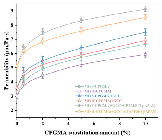 Figure 7, which compares the six stock systems, shows that as the CPGMA substitution amount grows from 0% to 10%, so does the air permeability of the sheet generated by these systems. The increasing trend can be divided into a rapid stage involving a substitution amount of <0.5% and a gradual stage involving a substitution amount of >0.5%. The results may be related to the strong hydrophobicity [] and high stiffness [] of CPGMAs. In addition, from the comparison of the six cases, the decrease in the sheet air permeability due to S-CPGMAs is observed to be higher than that due to H-CPGMAs mainly because S-CPGMAs are longer than H-CPGMAs [,]. Considering the practical application of CPGMA@CPAM/SiO2/APAM technology, only 0.5% CPGMA was added, and we found that 0.5% S-CPGMA increased the sheet air permeability from 5.11 μm/Pa·s to 6.49 μm/Pa·s, indicating an increase of 27.0%. The H-CPGMAs increased the sheet air permeability from 5.11 μm/Pa·s to 6.22 μm/Pa·s, indicating an increase of 21.7%. The results show that a small amount of CPGMAs can improve the paper air permeability, which is essential for some specialty papers.