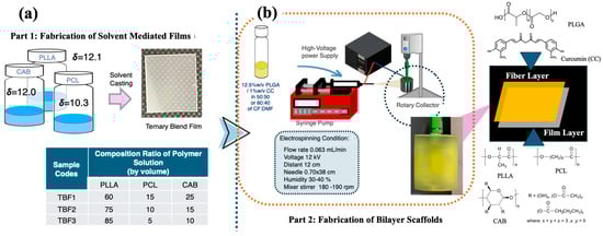 In this study, a ternary blend film layer consisting of poly(L-lactide) (PLLA), polycaprolactone (PCL), and cellulose acetate butyrate (CAB) was fabricated using the solvent casting method. Different compositions of PLLA, PCL, and CAB, along with the effects of chloroform (CF) and dimethylformamide (DMF) co-solvents, were examined in terms of surface morphology, molecular interactions, and tensile mechanical properties (Figure 1a). The selection of PLLA, PCL, and CAB was based on the known miscibility between the polymer pairs PLLA/CAB and PCL/CAB. CAB enhances the compatibility of these blends, resulting in films with high tensile elongation, as observed in previous research [,]. An electrospun fiber layer, incorporating CC into PLGA, was also fabricated. The effect of the co-solvent system on the surface morphologies was studied, including that of pure PLGA. PLGA (a semi-crystalline polyester) was chosen due to its sufficient mechanical properties and biodegradation [,,]. Finally, the most suitable ternary blend film and PLGA/CC electrospun fibers were selected to create a biodegradable bilayer scaffold. This was achieved by electrospinning the PLGA/CC solution onto the surface of the ternary blend films (Figure 1b). The surface morphology and adhesion between the film and electrospun fibers were analyzed using field emission scanning electron microscopy (FE-SEM). This newly designed bilayer scaffold, comprising a PLLA/PCL/CAB film layer and PLGA/CC electrospun fibers, is expected to provide strong mechanical support due to the film layer while offering a highly porous structure. The incorporation of curcumin adds active bioactivities, making the scaffold suitable for efficient tissue regeneration and drug delivery.
