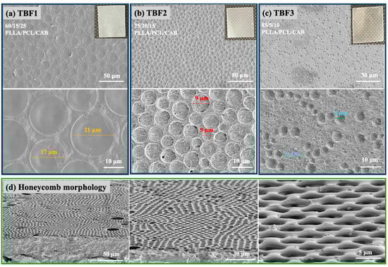 In addition, honeycomb structures were unexpectedly and unusually observed on the surface of the ternary blend of PLLA/PCL/CAB at a ratio of 60/15/25 with different manufacturing times for the solvent casting of TBF1 (Figure 2d). These honeycomb micrometer-scaled polymer patterns were caused by the condensation of water droplets, which occurs when water vapor contacts a cold surface. This phenomenon is associated with the rapid evaporation of polymer solutions exposed to humidity [,,]. The mechanism behind the formation of this honeycomb morphology is complex, involving thermodynamics and transport phenomena. A possible explanation is that the rapid evaporation of the solvent increases the superficial concentration, causing cooling of the solution surface and subsequently leading to the condensation of water. This process leads to phase separation with the formation of a polymer film at the solution surface, possibly around water droplets. These droplets create holes in the superficial spheres, facilitating the evaporation of both the solvent and water [,]. Therefore, the PLLA/PCL/CAB blend with a composition of 60/15/25 exhibited a microporous pattern due to various parameters: specific phase separation and agglomeration of PLLA, PCL, and CAB; evaporation of the polymer solution; nucleation, condensation, and growth of water droplets; evaporation of water and solvent; and solidification of the polymer []. These explanations can also describe the formation of porous structures in TBF1, TBF2, and TBF3, which can be observed in the cross-sectional FE-SEM images from the tensile test shown in Figure 3.