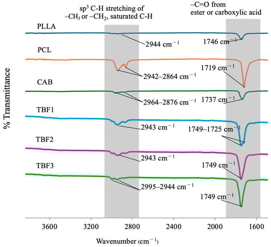 After observing the tensile strength and elongation of all the ternary blend films (TBF1, TBF2, and TBF3), which were significantly higher than those of pure PLLA, the molecular interactions of these blends were further studied and discussed in terms of miscibility, as observed by the FT-IR technique. This analysis is crucial because the mechanical performance of ternary polymer blends is influenced by their miscibility, which depends on the competition between recrystallization and intermixing of the polymers [,,,]. Figure 4 shows the FT-IR spectra of PLLA, PCL, and CAB and their blends in TBF1, TBF2, and TBF3. PLLA, PCL, and CAB all exhibit absorption bands corresponding to -C-H stretching of saturated -CH, -CH2, and -CH3 at 2750–3000 cm−1 and absorption bands of -C=O stretching from ester or carboxylic acid groups at 1700–1760 cm−1. A shift and broadening of the FT-IR absorption bands of carbonyl groups were observed in all ternary blends (TBF1, TBF2, and TBF3) compared to pure PLLA, PCL, and CAB. This can be caused by diminished intermolecular packing of PLLA, PCL, and CAB chains, along with potential molecular interactions, such as hydrogen bonding between CAB/PLLA or CAB/PCL. In these circumstances, the electron cloud distribution around carbonyl groups is changed, consequently affecting the resonant frequency and breadth of bands []. It is important to note that distinguishing the differences in the molecular interactions among the three ternary blend compositions (TBF1, TBF2, and TBF3) was challenging. However, the results from FT-IR demonstrated that all ternary solvent-mediated blends of PLLA/PCL/CAB at 60/15/25, 75/10/15, and 85/5/10 were most likely to be miscible or partially miscible, resulting in an enhancement of tensile elongation when compared to that of pure PLLA.