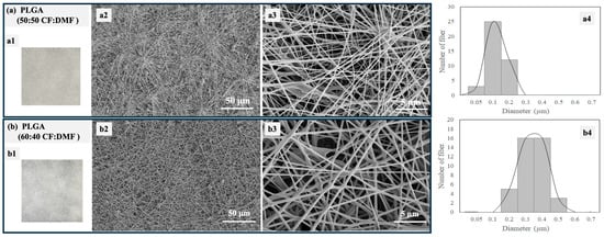 Optical photographs (a1,b1), SEM images (with different magnifications, a2,a3,b2,b3), and size distributions of PLGA electrospun fibers fabricated using different ratios of solvents (a4,b4): (a) 50:50 CF:DMF and (b) 60:40 CF:DMF.