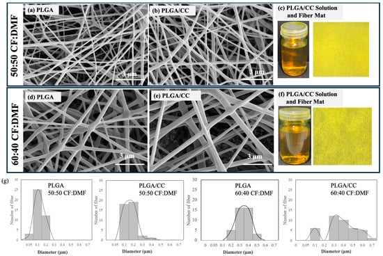 SEM images of PLGA electrospun fibers fabricated using 50:50 CF:DMF (a) and 60:40 CF:DMF (d), SEM images of PLGA/CC electrospun fibers fabricated using 50:50 CF:DMF (b) and 60:40 CF:DMF (e), Optical photographs of PLGA/CC solution dissolved in 50:50 CF:DMF and its electrospun fiber mat (c), Optical photographs of PLGA/CC solution dissolved in 60:40 CF:DMF and its electrospun fiber mat (f), along with their diameter size distributions (g).