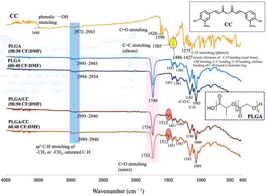 The chemical functional groups of CC, PLGA, and PLGA/CC fabricated in the co-solvent were also analyzed (Figure 7). The characteristic FTIR spectrum peaks of CC showed phenolic -OH stretching vibration at 3488 cm−1, -C=O stretching at 1626 cm−1 and 1599 cm−1, stretching vibration of C=C of alkene at 1505 cm−1, and mixed vibrations of C-O bending of enol form, O-H and C-C bending, and olefinic bending of C-H bound to benzene rings at 1486–1427 cm−1 [,,], whereas PLGA (spun using both 50:50 and 60:40 CF:DMF) showed mainly -C=O stretching at 1749 cm−1 and C-O-C and C-O vibrations at 1182 and 1085 cm−1, respectively. The FTIR spectra of the PLGA/CC electrospun fibers (spun using both 50:50 and 60:40 CF:DMF) showed the characteristic peaks of both CC and PLGA. However, the absence of phenolic -OH stretching, a small shift in -C=O stretching (ester), and the formation of stronger peaks observed at 1512 cm⁻¹ indicate that PLGA and CC bonded together. This bonding was likely due to interactions between the carbonyl groups of PLGA and the phenolic hydroxyl groups of CC. This interaction was enhanced by the improved dispersion of CC (a hydrophobic filler) into PLGA (a hydrophobic material), resulting in a strong bond between the two materials [].