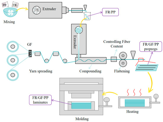 A schematic diagram of the preparation process of FR/GF/PP composite laminates is shown in Figure 1. FR/GF/PP prepregs were prepared using a continuous fiber-reinforced thermoplastic composite prepreg production line homemade in the laboratory. FR/PP pellets were melted at the extruder head position and infiltrated with continuous glass fibers, rolled, cooled, and shaped to prepare the FR/GF/PP prepregs. FR/GF/PP prepregs were cut according to the size of the mold; after cutting, the prepreg sheets were placed into the mold to be heated and melted (200 °C, 20 min), then quickly transferred into the molding machine at room temperature for rapid pressurization (25 °C, 7 MPa) and taken out after holding pressure for 10 min. Finally, they were cut into the required sizes for each test using waterjet cutting equipment. In order to reduce the effect of fiber orientation on performance, the FR/GF/PP laminates were unidirectional. The fiber content was 10% volume content.