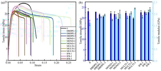 (a) Stress–strain curves, (b) tensile modulus and tensile strength of PP modified with different flame retardants.