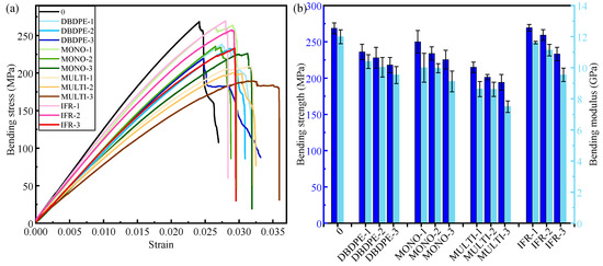 The three-point bending properties of GF/PP composites modified with different flame retardants are presented in Figure 3. The bending strength of the blank control composite is 268.56 MPa and the bending modulus is 11.99 GPa.