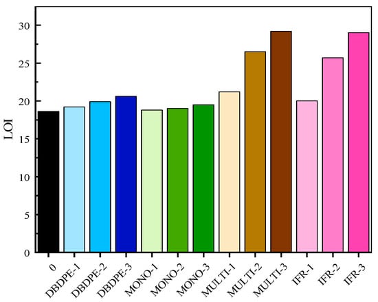 For the specimens with the addition of DBDPE and MONO flame retardants, the variation in the LOIs is not significant, the enhancement of flame retardant performance is limited, and the flame retardant effect is not ideal. The LOIs of the composite specimens with MULTI and IFR flame retardants increase significantly with the increase in flame-retardant addition. In the samples with MULTI flame retardant, the LOIs of the samples are 21.2, 26.5 and 29.2 at the content of 8.00%, 14.81% and 20.69% of flame retardant, respectively, which are 13.97%, 42.47% and 56.99% higher than that of the samples in the blank control group. In the samples with the IFR flame retardant, the LOIs of the samples are 20.0, 25.7 and 29.0 at the contents of 8.00%, 14.81% and 20.69% of flame retardant, respectively, which are 7.52%, 38.17% and 55.91% higher than those of the samples of the blank control group, respectively. MULTI and IFR are multi-component flame retardants and have higher LOI. Multi-component flame retardants can inhibit material combustion in more ways than a single component, which may result in a better LOI.