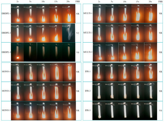 The combustion process of the vertical combustion rating test of composite specimens with different flame retardants is presented in Figure 6.