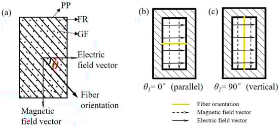 Schematic diagram of fiber direction and electric field direction, (a) θ position, (b) θ = 0°, (c) θ = 90°.