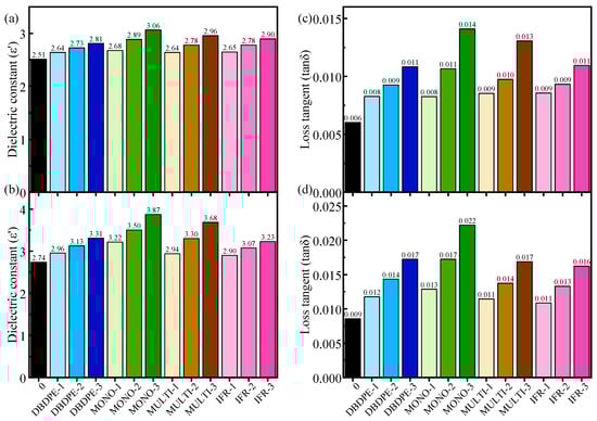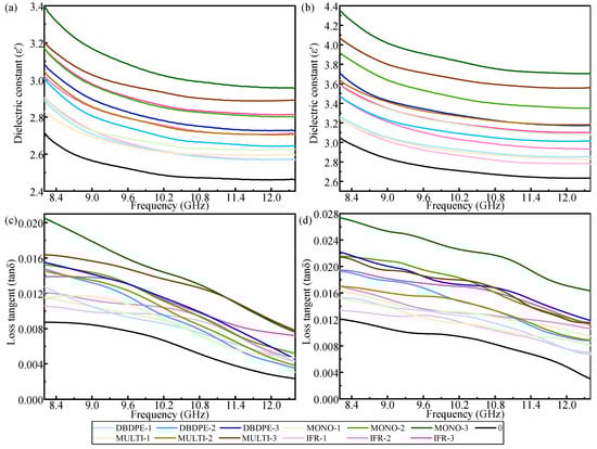 Average dielectric properties of FR/GF/PP samples in X-band, (a) dielectric constant at θ = 90°, (b) dielectric constant at θ = 0°, (c) dielectric loss tangent at θ = 90°, and (d) dielectric loss tangent at θ = 0°.