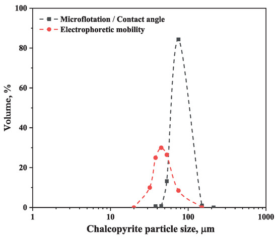 Particle size distribution of the chalcopyrite used for electrophoretic mobility, microflotation, and contact angle tests.