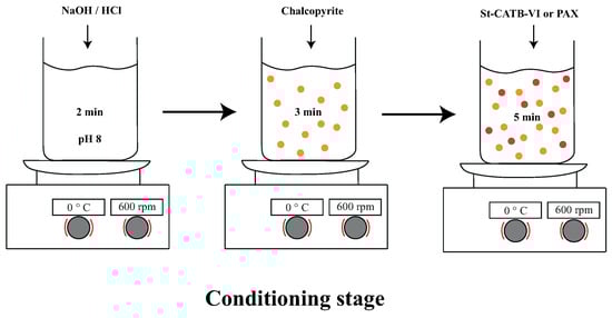 The procedure of addition of reagents and minerals in this stage was the following: the first 2 min corresponded to a pH adjustment of the solution used to pH 8, then the mineral chalcopyrite was added and the suspension was conditioned until 5 min. Next, the selected collector was added and conditioned for 5 min. Finally, the MIBC was added 1 min before finishing the conditioning stage (only in microflotation tests). It is important to note that the montmorillonite (only when it was considered) was added after the conditioning time of chalcopyrite and the stirring was held for 2 min. In addition, when the effect of mixtures of NPs and PAX was studied, the collector PAX was added at the conditioning time with the NPs, and the suspension was stirred for 5 min.