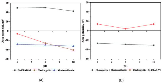 Figure 5 shows the zeta potential of chalcopyrite, montmorillonite, and St-CTAB-VI NPs as a function of pH (Figure 5a). In the figure, it can be observed that the St-CTAB-VI NPs have a positive surface charge throughout the pH range studied (6–10), with a maximum value of 50 mV at pH 8 and a minimum value of 42 mV at pH 10, which is consistent with the report by Murga et al. (2022) [33]. In the case of the chalcopyrite, it had a negative potential in the range of pH studied, obtaining values between −6.06 mV (pH 6) and −40.69 mV (pH 10). Ma et al. (2016) [34] found the point of zero charge (PZC) of chalcopyrite to be at pH 5.7, a value that is consistent with the trend shown in this figure. On the other hand, in the case of montmorillonite, studies of the zeta potential of montmorillonite by Delgado et al. (1986) [35] and Au and Leong (2016) [36] reported an almost permanent negative charge of −25 to −35 mV in the pH range of 6 to 10. For montmorillonite in these tests, the zeta potential remained stable at a value of around −30 mV in the range of pH studied.
