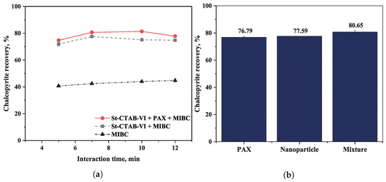 Figure 6a shows the results obtained for chalcopyrite recovery at different interaction times of the chalcopyrite with St-CTAB-VI NPs and mixtures of NPs (7.5 mg/g) and PAX (5.6 mg/g), in the presence of montmorillonite. In the figure, it can be observed that a higher chalcopyrite recovery was obtained for interaction times between 7 and 10 min and using mixtures of NPs and PAX.