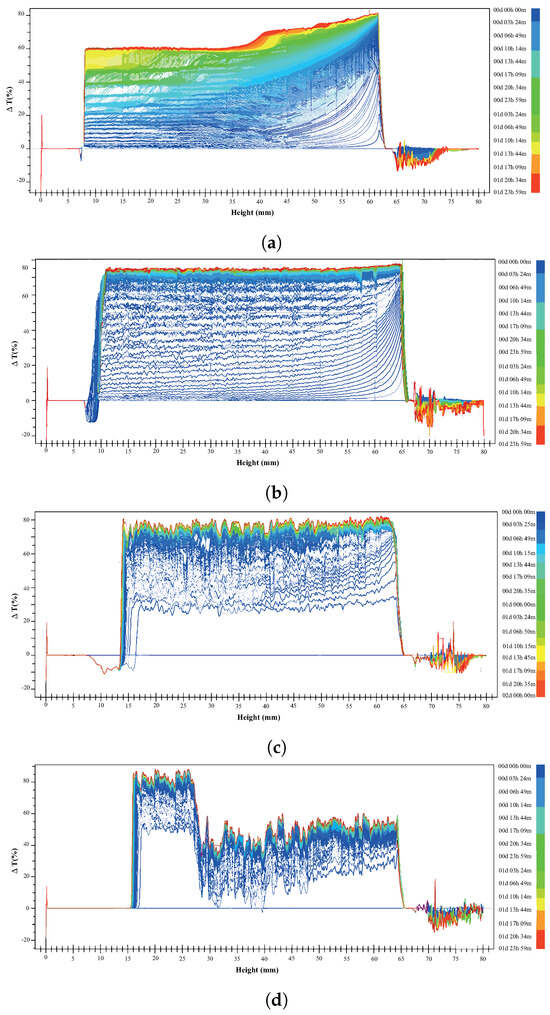 Figure 8a–d show the delta transmittance curve obtained as a function of time for the following suspensions prepared in 5 mM NaCl at pH 8: 15% montmorillonite (Figure 8a), chalcopyrite + 15% montmorillonite (Figure 8b), chalcopyrite + 15% montmorillonite + St-CTAB-VI (Figure 8c), and chalcopyrite + 15% montmorillonite + St-CTAB-VI + PAX (Figure 8d), using 7.5 mg of NPs and 5.6 mg of PAX per gram of chalcopyrite. The different graphics are divided into a lower zone of the tube between approximately 0 and 15 mm, a middle zone between approximately 16 and 65 mm, and a high zone between 65 and 80 mm, which is the upper part of the tube, as shown in Figure 7.