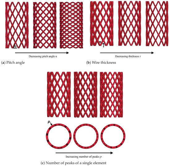 The pitch angle, denoted as and illustrated in Figure 1a, is a critical design parameter. The extensive research highlighted its profound impact on the radial force of the stent [37,48,49,53]. Within this structural context, the pitch angle significantly influences the stent’s radial recoil, thus warranting thorough evaluation in simulations. The values assigned to this parameter also shape the geometry of the cell unit, transitioning from longitudinally to radially oriented rhombuses, with an intermediate squared configuration in between. Specifically, three distinct values are chosen for this parameter, ranging from to , with an intermediary value of (refer to Figure 1a).