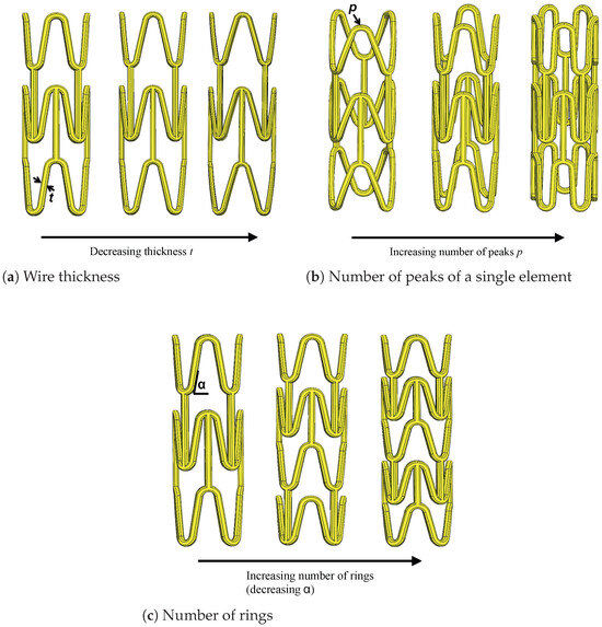 Just like the X-pattern, in the W-pattern, three design parameters undergo analysis to study their impact on the stent’s mechanical properties. In this scenario, the three features include the strut thickness, the number of elements (number of rings) and the number of peaks within a single element. The baseline geometry, from which the parameter variations are derived, features a wire diameter of mm, 4 peaks and 3 rings (refer to Figure 2a).
