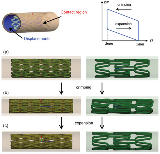 Boundary conditions of the models. The inner cylinder surface initially contacts with the external stent surface. Radial displacements are imposed to the internal cylinder surface. The crimping step is followed by the expansion step. 5 mm and 3 mm are the initial and minimum diameters, respectively. An idealized radial force RF vs. diameter D curve for the radial crimping procedure of a biodegradable stent is shown in the graph. RF values are evaluated in the expansion step. In (a–c), the situation of the stents before and after crimping and expansion is shown.