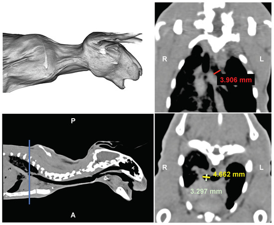Ex vivo study: Computerized tomography images of a cadaveric rabbit head, neck and thorax. Upper left: 3D rendering. Upper right: Dorsal multiplanar reconstruction. Lower left: sagittal scan. Lower right: transversal scan. Red line: right bronchial length. Yellow and green lines: left bronchial diameters. Blue line: anatomical locator. L = left, R = right, A = anterior, P = posterior.